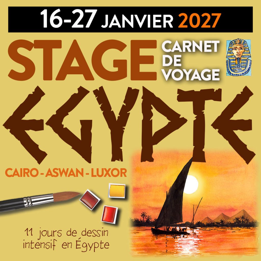 Le stage carnets de voyage Égypte 2027 est un stage de dessin de voyage de 11 jours (du 16 au 27 janvier) consacré à la découverte et au dessin en Égypte. Les débutants sont les bienvenus, mais une certaine expérience du dessin vous permettra de profiter pleinement de cet atelier.