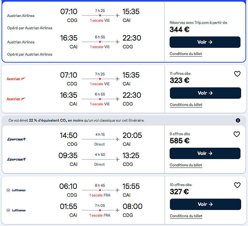 - Vol aller-retour á Le Caire: environ 340 €. Les prix augmentent à mesure que la date approche.